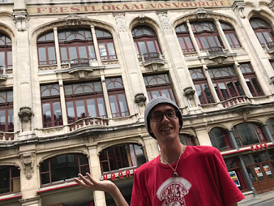 And because Rabbit & Robot makes a rather dark prediction about where capitalism is taking us, here’s a picture of my son standing in front of a meeting hall for socialists in Ghent.