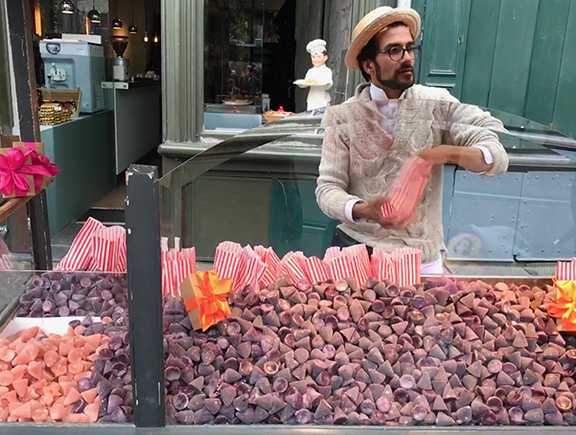 It’s impossible for me to pick a “most favorite” because everywhere I’ve been has been unique in ways that set it apart from anywhere else. I like the experience of newness. That said, last summer I took my son to Europe and during part of our trip we stayed with my friends Els and Guy at their home in Geraardsbergen, which I had never been to before and I thought it was lovely. They took us to the city of Ghent, another place I’d never been, and I thought it was one of the most spectacularly beautiful little cities I’ve ever seen. There are these candy sellers in Ghent who set up carts about five feet away from each other, and they make the same product, candy noses, so they compete with each other. And they hate each other, and have even gotten into fistfights before over whose candy noses are better. It’s quite an interesting and bizarre story. Here’s a picture of one of the guys with his candy noses: